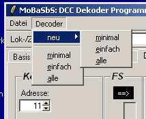 das Menu 'Decoder' kann eine neuer Dekoder-Typ eingestellt werden (Untermenu