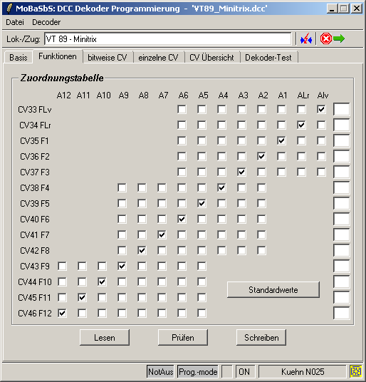 der Software gesetzten CV-Werte mit dem aktuellen Werten im Dekoder
