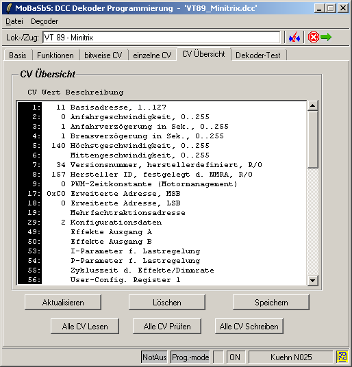 ausgegeben. Alle CV Schreiben - Alle CV-Werte des Dekoders werden