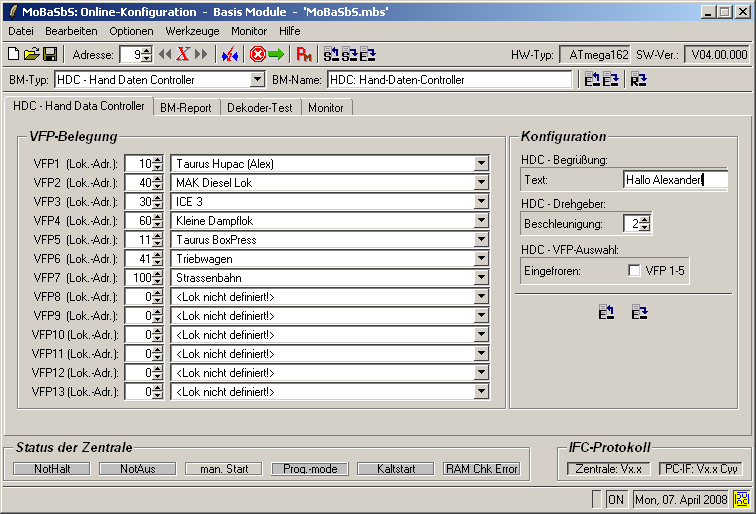 Begrüßungstext auf die Lok.-Adressen für die max. 13 virtuellen Fahrpulte (VFP) zugewiesen werden.