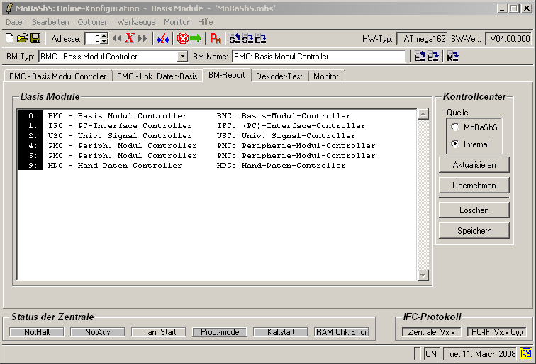 ('MoBaSbS'=Hardware, 'Internal'=interne Datenbasis) ausgewählt und die
