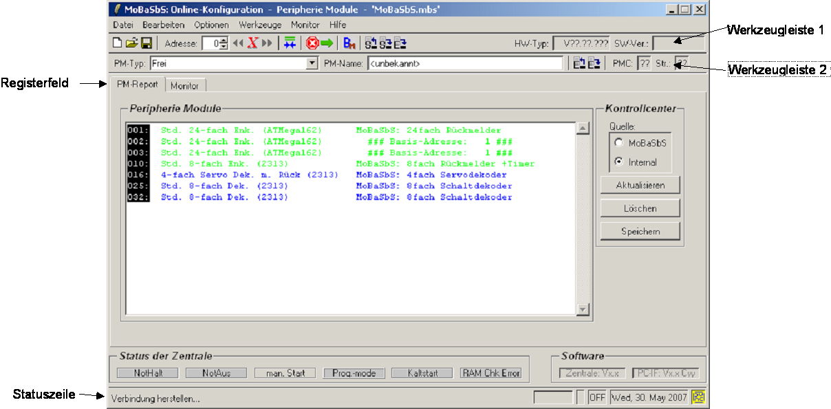 Nach dem Start des Programms erscheint das unten abgebildete Fenster. Man erkennt im oberen Teil die Menüleiste, darunter die Werkzeugleisten 1 (allgemeine Funktionen) und 2 (je nach Ansicht mit Funktion für Basis- oder Peripherie-Module). Im mittleren Bereich des Fensters befindet sich das Feld mit den verschiedenen ‚Registerkarten‘, die die Masken für die verschiedenen MoBaSbS-Module sowie den Monitor enthalten. Darunter befinden sich diverse Status-Informationen der Zentrale sowie die Software-Versionen (PC-IF und Zentrale). Am unteren Fensterrand befindet sich die Status-Zeile der Konfigurations-Software, in der verschiedene Informationen während der Arbeit mit dem Programm angezeigt werden. Diese enthält auch einen 'Progress-Bar', die den Fortschritt von länger andauernden Operation visualisiert.