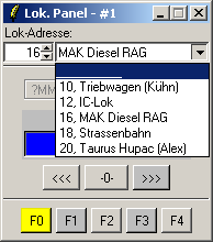 In jedem Panel kann die Lok-Adresse direkt oder über das Pull-Down-Menu