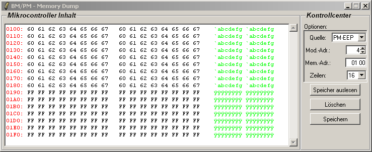 Speicher dann durch Drücken des Knopfes 'Speicher auslesen' gelesen und